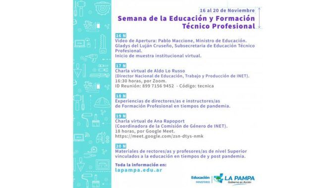 En el sitio web del Ministerio de Educación de La Pampa, estará disponible un video institucional de bienvenida a cargo del ministro de Educación de La Pampa, Pablo Maccione, y la subsecretaria de Educación Técnico Profesional, Gladys del Luján Cruseño. Además, se podrán visualizar una muestra institucional virtual, experiencias educativas de nivel Secundario, Superior y Formación Profesional en relación a prácticas profesionalizantes, propuestas de enseñanza de manera presencial, no presencial o alternada y perspectiva de género.