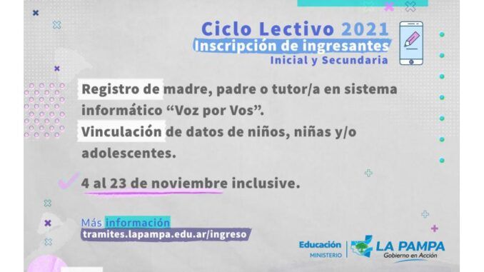 Registro en “Voz por Vos”: 4 al 23 de noviembre inclusive Vinculación de datos de niños, niñas y/o adolescentes en el sistema informático: 4 al 23 de noviembre inclusive. Inscripciones de ingresantes a Inicial y Secundaria: 23 al 9 de diciembre inclusive. Para obtener más información, pueden visitar el sitio web https://tramites.lapampa.edu.ar/ingreso/ . Ante consultas, comunicarse a las siguientes líneas telefónicas a través de llamadas y/o WhatsApp de lunes a viernes entre las 8 y 14 horas: 2302 – 15 660524 / 2954 – 15 712540 / 2954 – 15 732158.