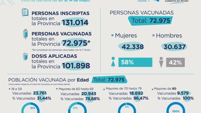 El Poder Ejecutivo Provincial, a través del Ministerio de Conectividad y Modernización y el Ministerio de Salud, informa en placas gráficas adjuntas los cuadros estadísticos de la marcha del Plan de Vacunación contra la COVID-19.