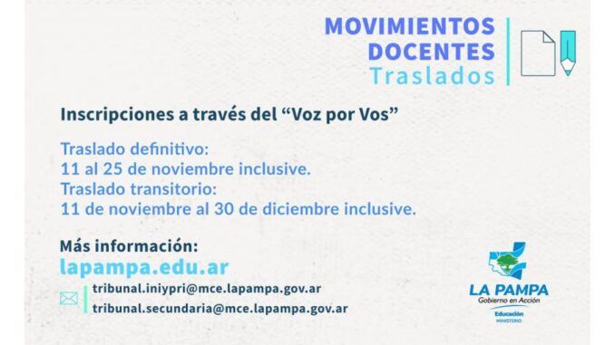 Las Subsecretarías de Educación y de Educación Técnico Profesional informaron las fechas de inscripciones para los movimientos docentes “Traslado Definitivo” y “Traslado Transitorio”, las cuales se realizarán de manera virtual a través del sistema informático “Voz por Vos”.