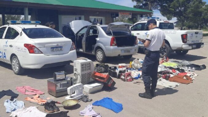 El robo fue denunciado anoche por una vecina de Realicó a sus autoridades policiales locales, quienes se comunicaron con sus colegas de Eduardo Castex para solicitar atención a un Renault Logan gris que podría transportar elementos robados en la localidad norteña. Los oficiales castenses actuaron, mediante aviso al fiscal Cupayolo, secuestraron el auto, detuvieron a los detenidos y esta mañana requisaron el vehículo que sí contenía electrodonmésticos y prendas de vestir.